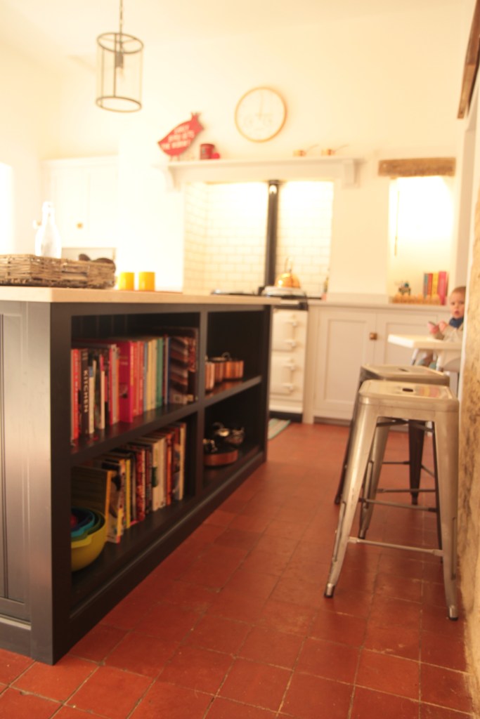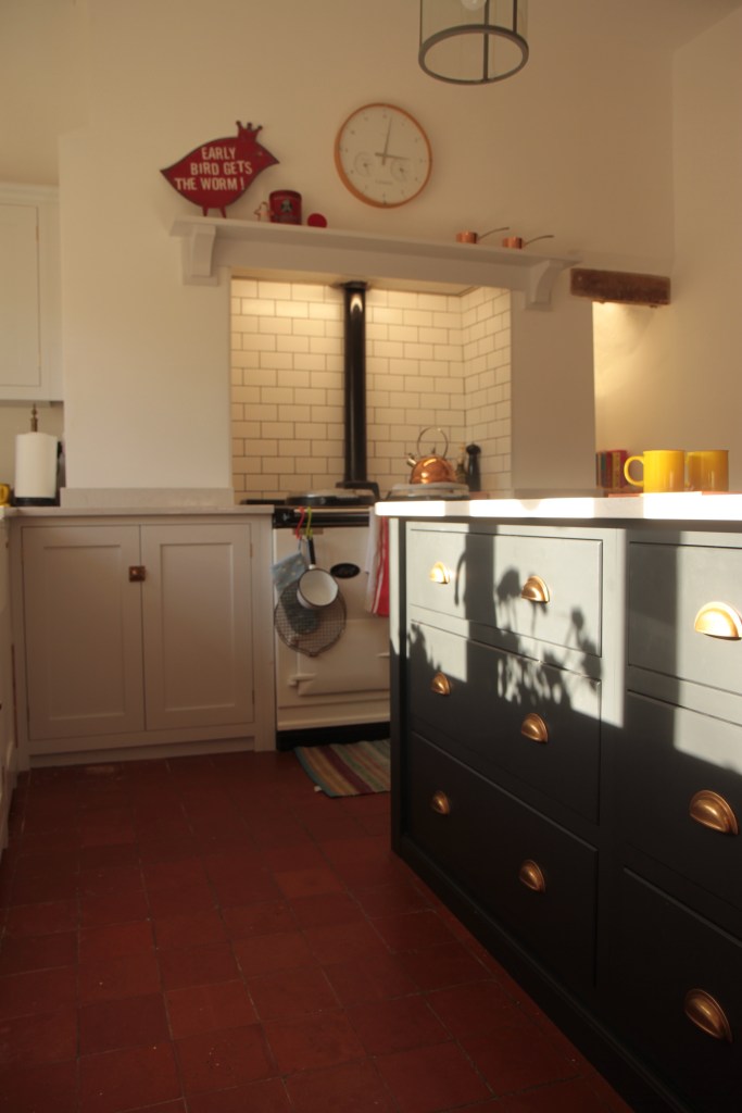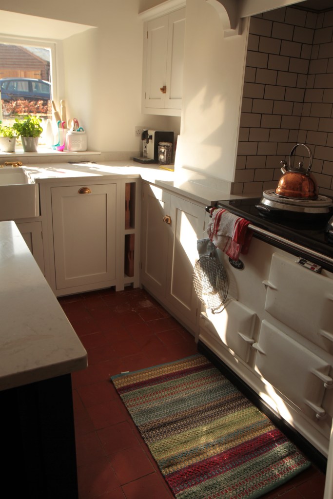 The kitchen has high ceilings with hop hooks. Even though there is only one window, light streams through in the afternoon and it is a beautiful bright room. All we had to do was measure up our wonky space and then squeeze just enough kit and cupboards in to suit our needs and to match the original quarry tile floor which is essentially bright orange!