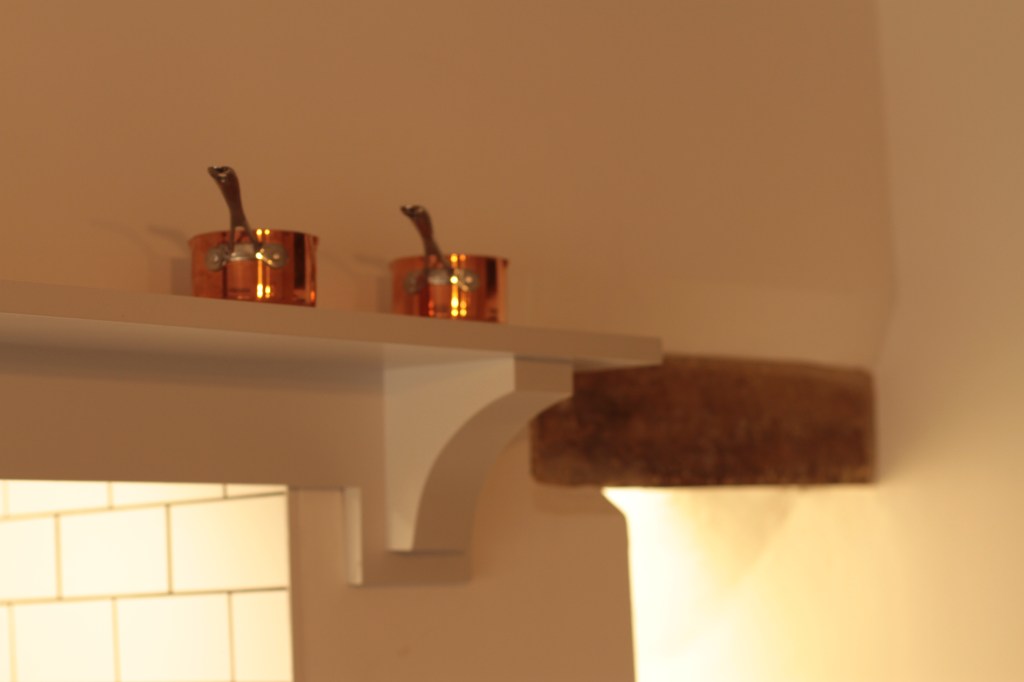 The stone wall wasn’t the only treasure we found. Once we had removed old cupboard doors set around the alcoves to the left and right of the Aga we also found a lovely little beam and some fantastic original wallpaper that was vinyl and I suppose may herald from the fifties. We put pieces of this into box-frames and hung them in the short hallway by the pantry as a ‘kitch’ throw back to the room’s history.