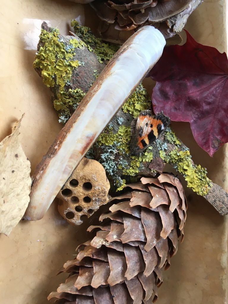 There are lots of treasures to be found for kids in the great outdoors, no metal detector required! My daughter grabs all sorts of pretty leaves of all shapes and sizes, pine cones, impressive looking stones, the occasional dead butterfly. You get the gist. So to house all these fine treasures we have a tray in the back porch at home where they are all arranged and it looks rather botanical and decorative. I’ve managed to toss out some of the more revolting ‘treasures’ and organise everything else. It works particularly well when we go to the sea side and come back with a few shells to add to the mix. Happy memories.