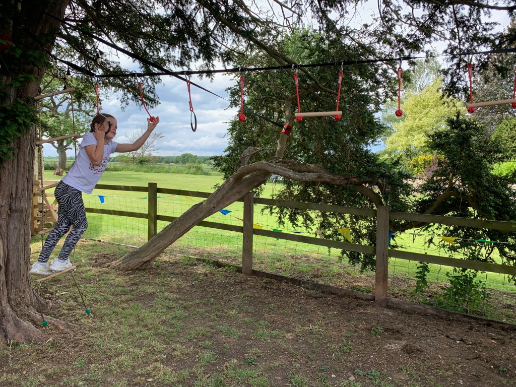 These are essentially ratchet straps like you see on lorries. Sorry I am probably massively oversimplifying this! But as far as I can see from the set I bought, it’s a strap with a ratchet that I’ve strung between two trees in our garden. You can get Ninja line kits that are for balancing that you walk like a tight rope and are fairly low to the floor, but I went for the monkey bar option as my daughter is obsessed with monkey bars. The line goes between two trees and is festooned with hanging bars, balled ropes and hoops that kids can swing along.