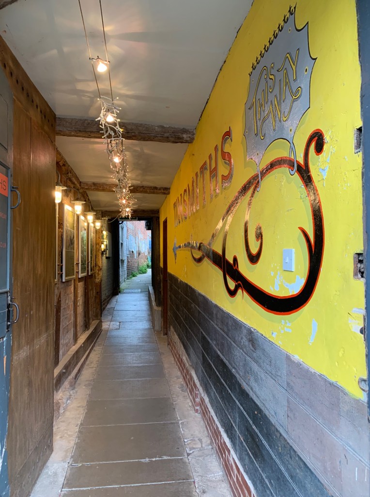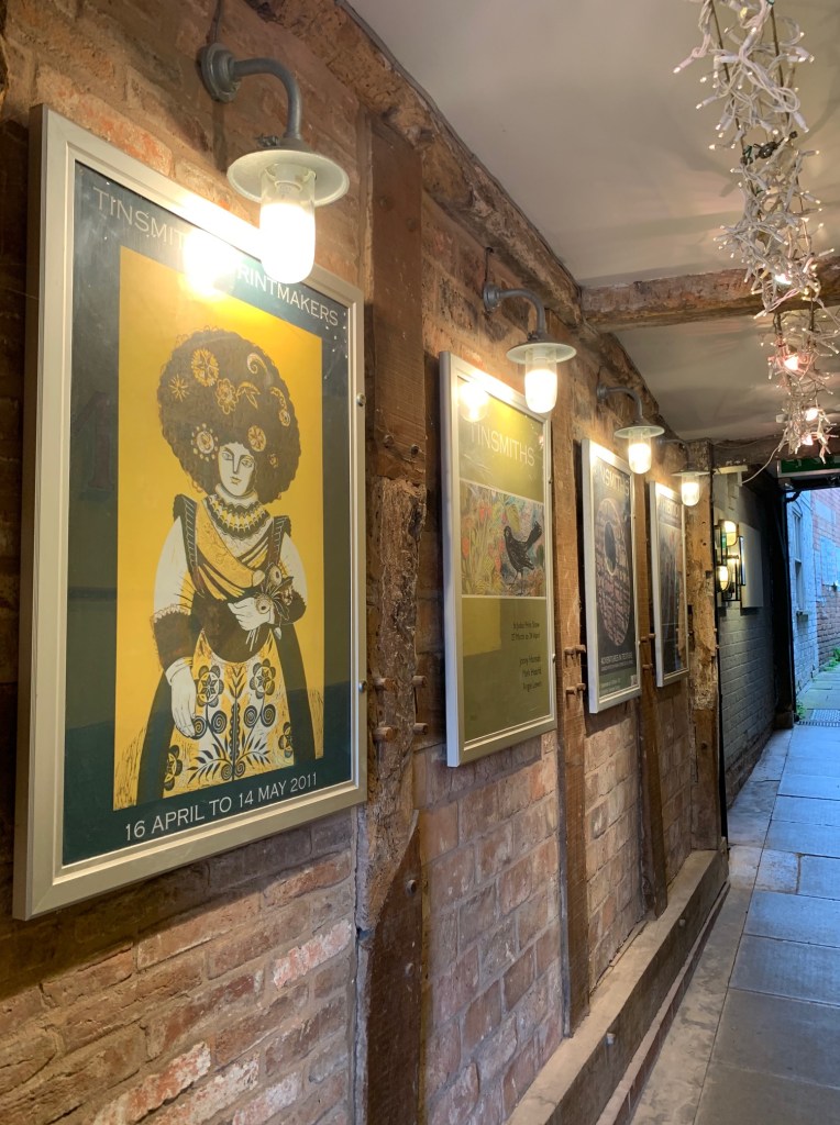 Tinsmiths is set in the beautiful heritage section of the high street down a fairy lit alley full of posters and murals. When you reach the shop itself you find it in two parts with a small courtyard in-between. One half is a 16th Century former tinsmiths workshop and the other is a space age glass bauble of a building.