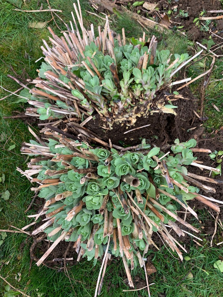 - Next take your pieces and get them back in the ground again by digging a hole large enough to make them comfy, add compost if you fancy, tuck them in and give them a good water.