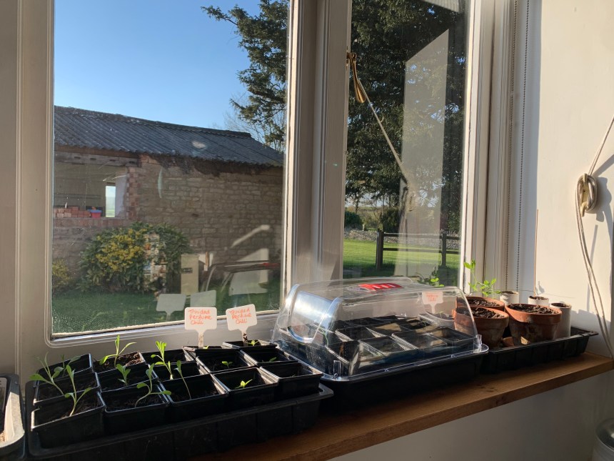 I have a window sill in my utility room which gets pretty good sun and is ideally positioned for lavishing attention and expectation on lots of little pots of all shapes and sizes. Little pots of compost housing an optimistic variety of haphazardly labelled seeds . The utility room is conveniently next to the kitchen and has a sink so that means the little green munchkins that manage to get started shouldn’t theoretically be left to shrivel and die. I pop in and out of the utility many, many times a day to the fridge there, to do laundry or just to waft around with the first cup of coffee of the day. During these times I can sprinkle said seedlings with a teeny tiny watering can I keep right next to the tap. Foolproof! Even easy perhaps. I’ve often day dreamed of having a greenhouse, but I suspect I wouldn’t find the time each day to actually go in it, so the window sill is perfect for now.