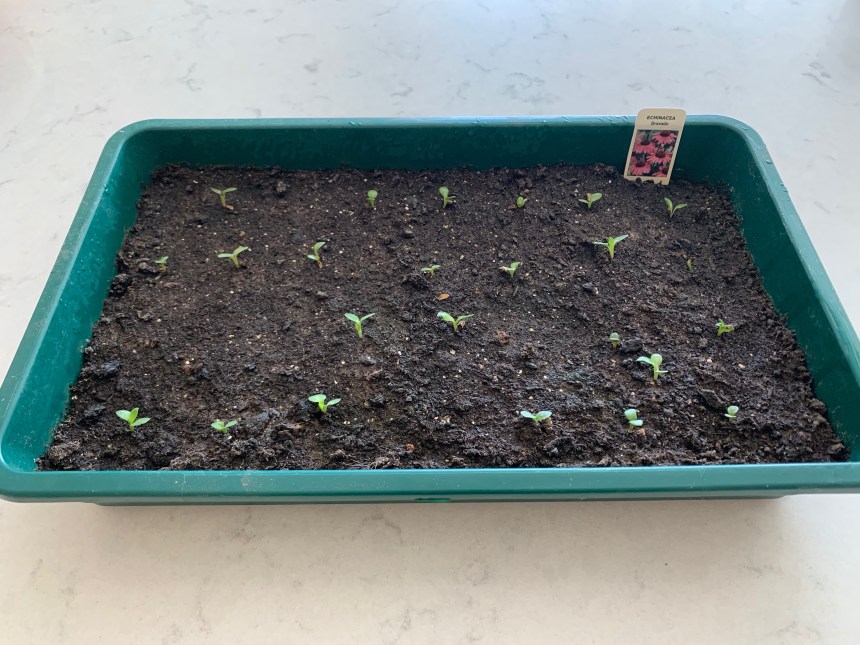 However, compare that to the tray on the right, which is Echinacea and this is a different story. I’m feeling quite smug with this tray of little seedlings. I’m hoping they grow on strongly and I can pot them on and get them out in the walled garden this Summer. I already have Echinacea there and I would love to have lots more. Given that this pack of seeds behaved themselves, I shall see what other types and colours are available and see if I can repeat the process.