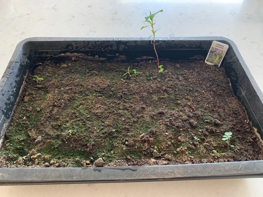 All that being said and given that I’ve have arranged my seedy enterprise with absolute ease in mind, I get hilarious results. The Verbena below left has been carrying on for so many weeks now the compost has gone green. Aside from the one leggy weed (I really don’t think it is Verbena) and a few stragglers, nothing much happened with this effort. I really love Verbena and fancied having lots of little ones to plant out at the back of the borders in the walled garden, but I think I might give up on growing them from seed. To be honest they self seed all over the place in the garden so I might change tack and just carry on digging up those errant waifs and strays and replant them where I want them. They grow in the garden path a fair bit and seem quite tough in terms of pulling them up and relocating them. The back of the seed packet mentioned possibly putting them in the fridge if they didn’t germinate uniformly. I did do that, but to no avail. I might chuck the rest of the pack on the garden path, that seems like a more fruitful plan.