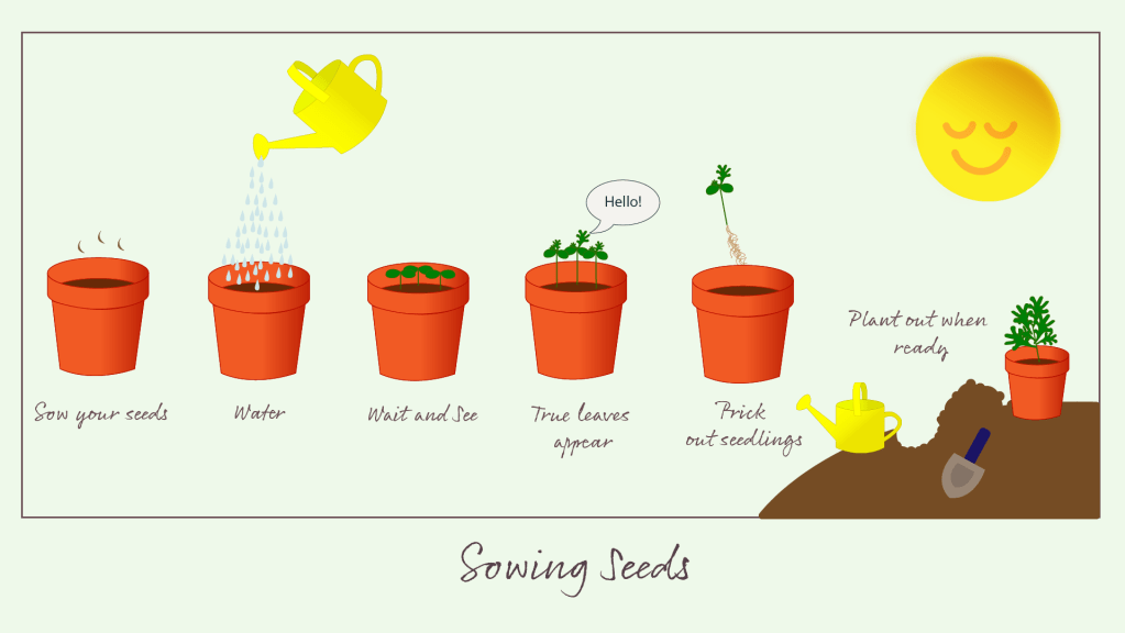 Once you have gathered your chosen seeds, the timing is right, you have some compost and something to put it in, it’s time to have a go. Seeds need water, oxygen and the right temperature to germinate, as well as a bit of patience.